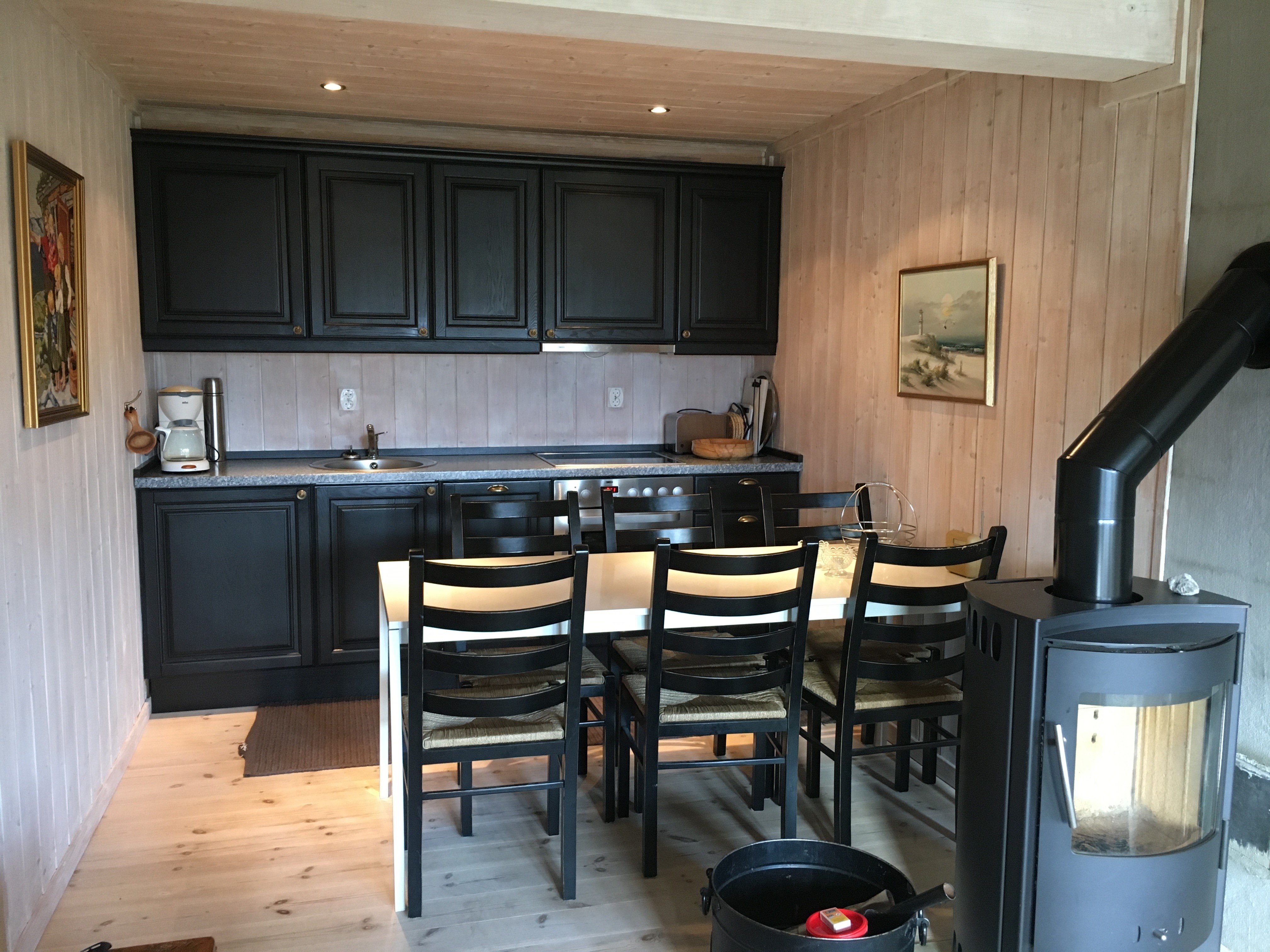 Kjøkken: Stekeovn, komfyr, kjøl/frys, oppvaskmaskin, vannkoker, kaffetrakter. Er godt utstyrt til matlaging. Spisebord for 6 personer.