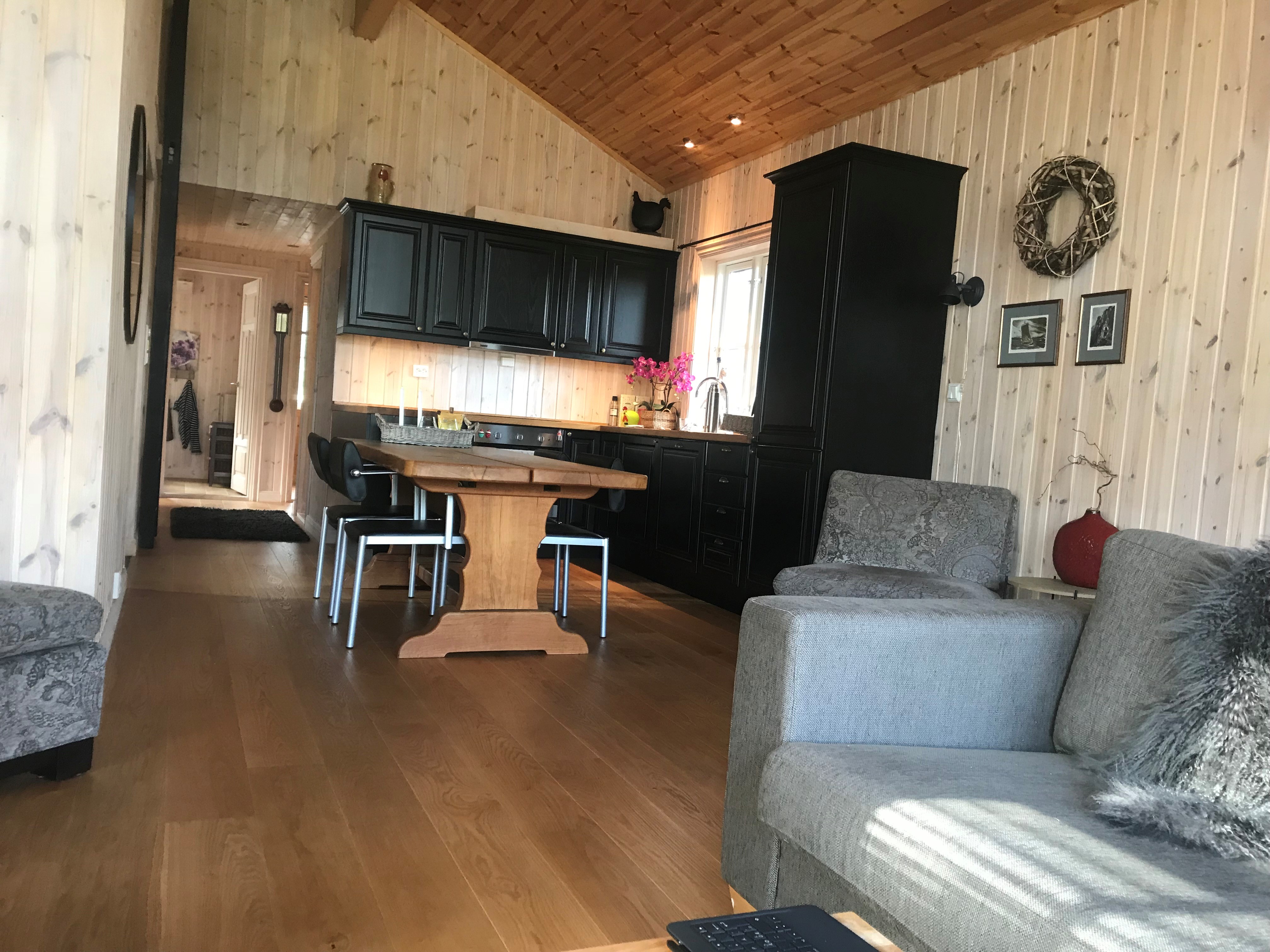 Kjøkken: Stekeovn, komfyr, kjøl/fryseskap, oppvaskmaskin og kaffetrakter. Er godt utstyrt for matlaging. Stort spisebord med god plass til 8 stk.